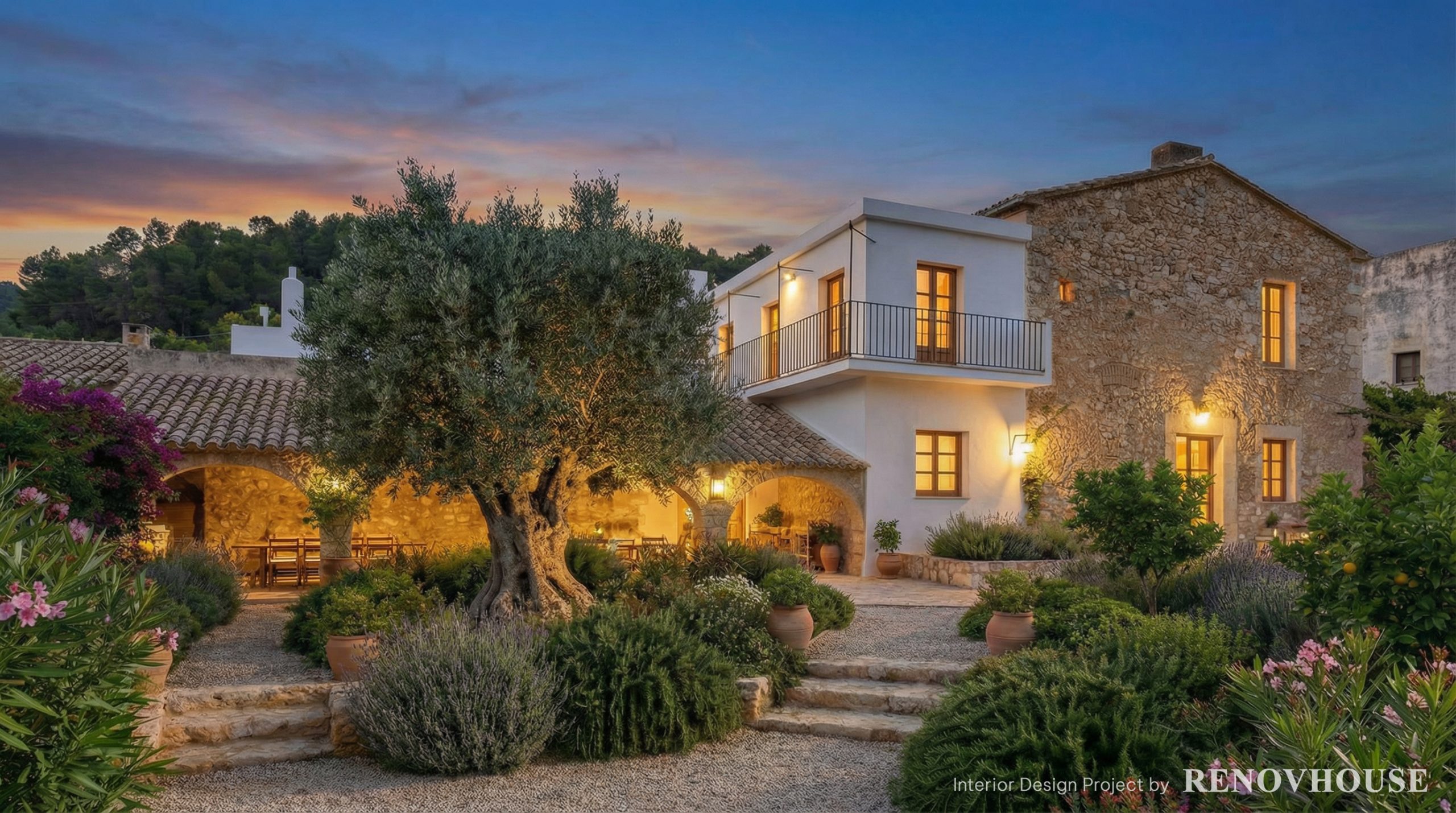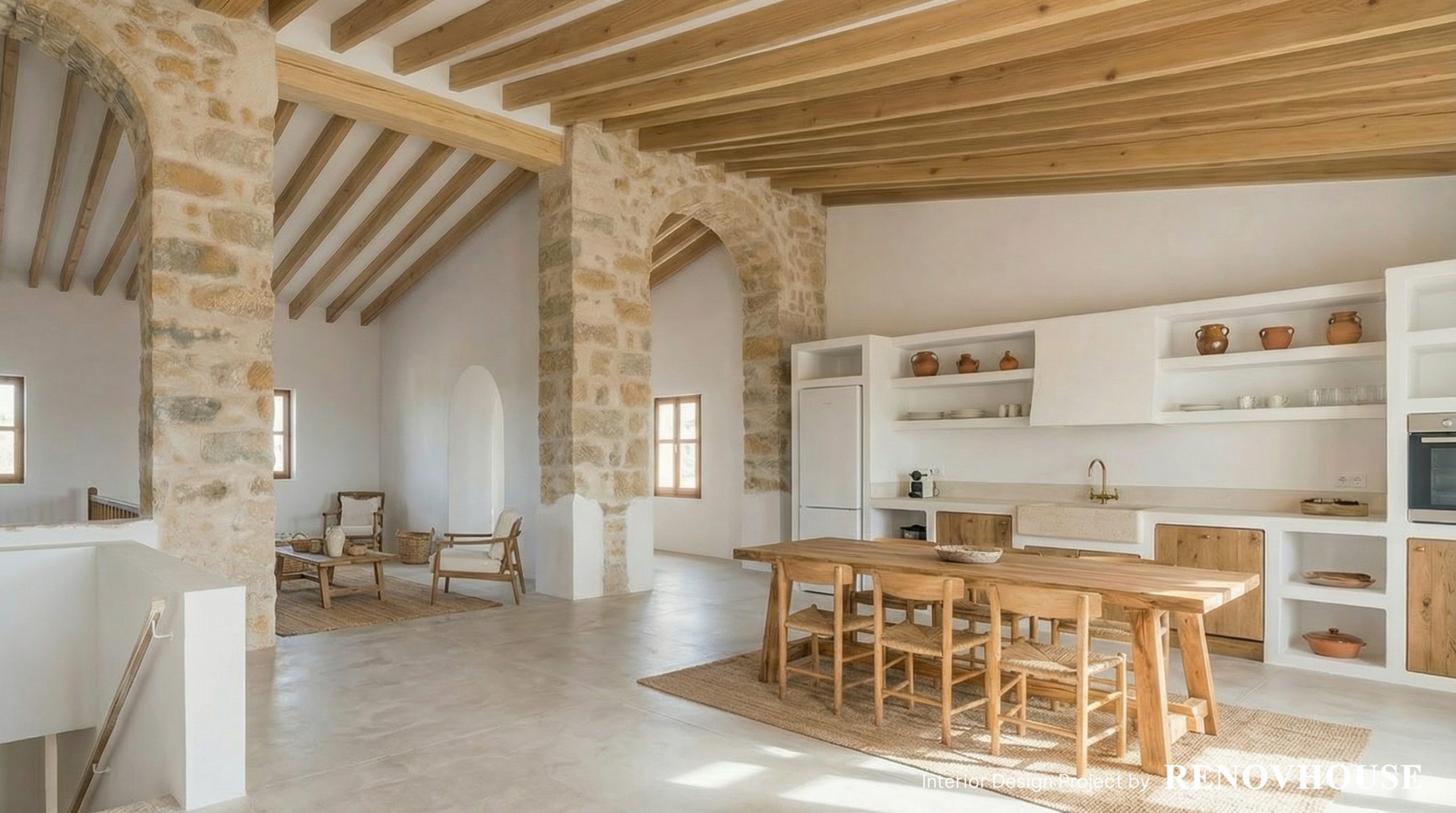 Se conservan los muros de piedra, los arcos y la volumetría tradicional. - Introducir una estética mediterránea contemporánea