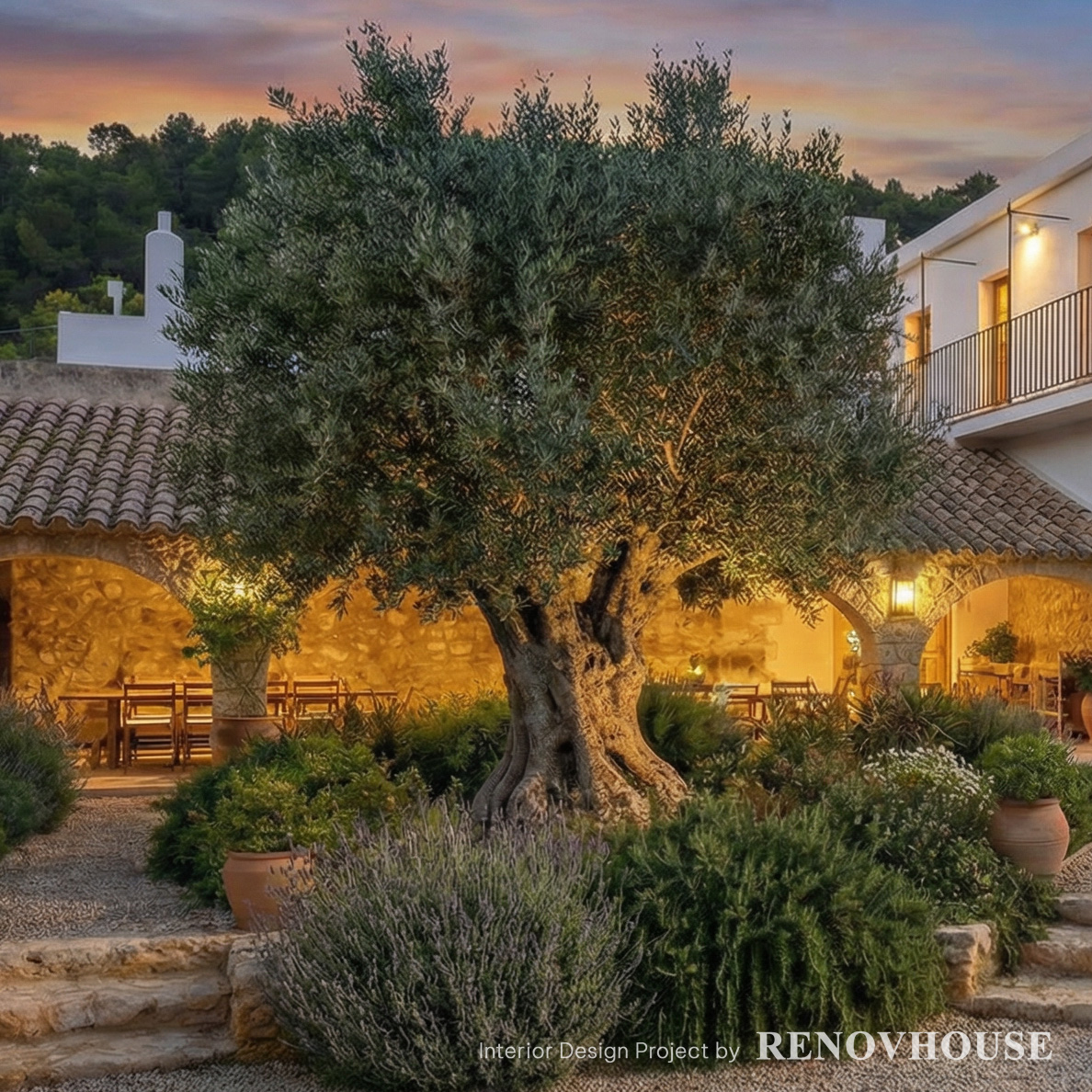 Paisajismo mediterráneo con olivos, lavanda y grava natural